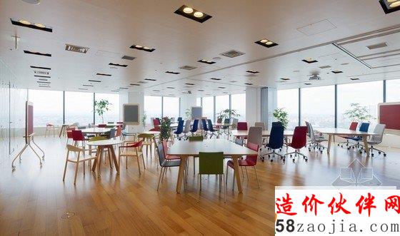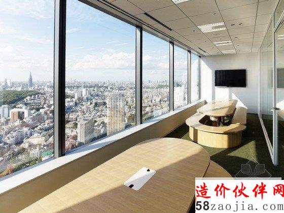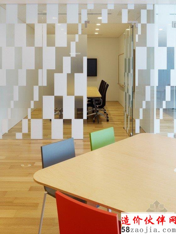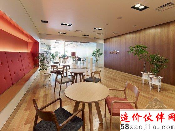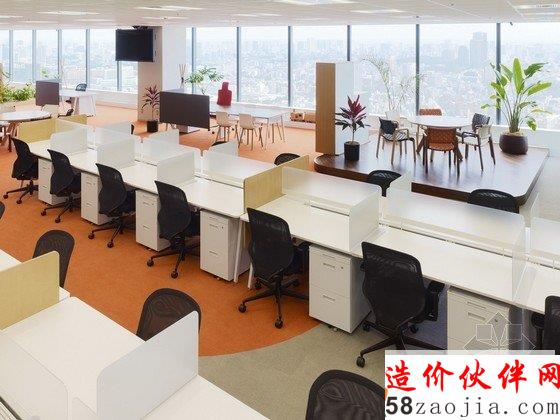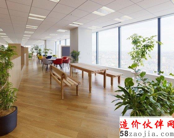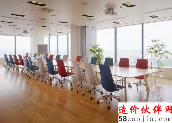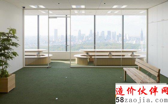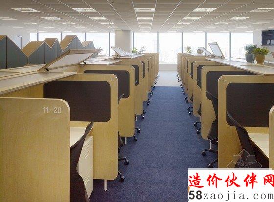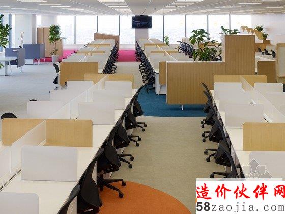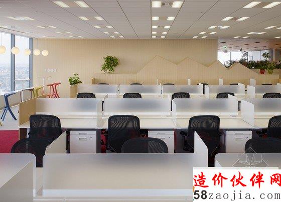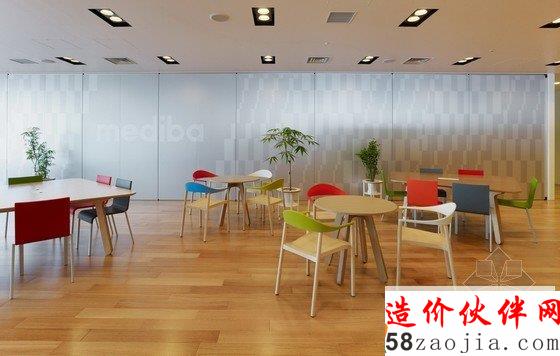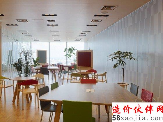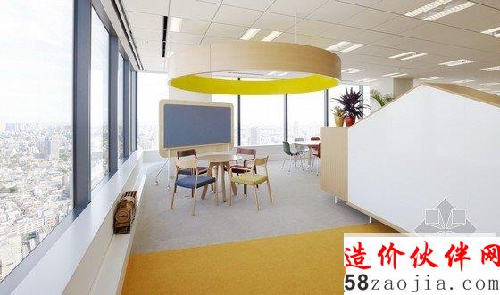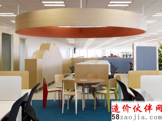 办公室内部为宽敞的开放区,包括前台、会议室和办公区,能容纳400名工作人员在此办公。开放式办公室位于大楼的第31层,入口处风景优美,会议室里有可移动的墙壁、桌椅、盆栽等,这些都使会议室具有非常强的可塑性。创意开放式办公室设计用不同的地面颜色区分不同的部门,有利于促进员工之间的交流。办公区内散布着搁物架等家具,搁物架是由染色的橡木制成的。创意开放式办公室设计还有一个小型的木制电车沿着窗户和公共设施运行,这个电车是由智能电话技术操纵的,在不同部门之间运送文件。建材和色彩的选用使办公室气氛温馨。
