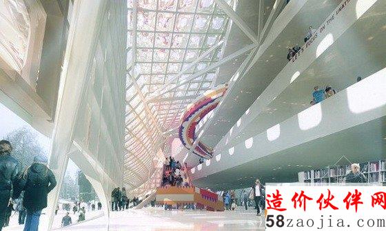 图书馆的功能通过6条相互交叉的轴线进行组织,形成了极具吸引力的狭长空间,为图书馆各个功能区创造出丰富多样的空间类型。六层的建筑中每层的轴线都指向周围不同的著名地标性建筑,使这座图书馆成为赫尔辛基象征意义上的中心。