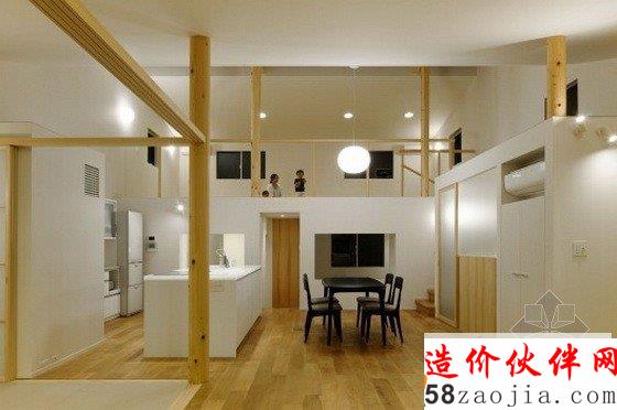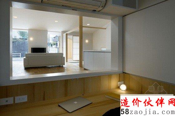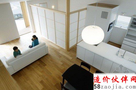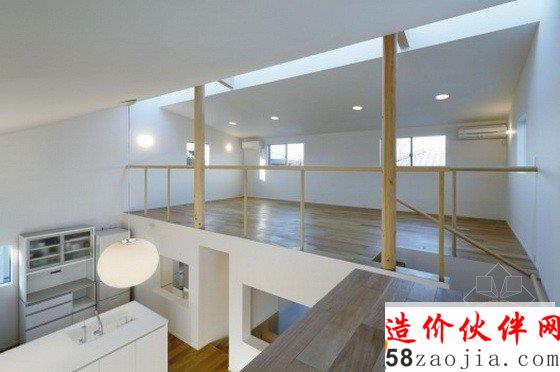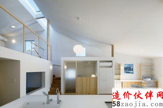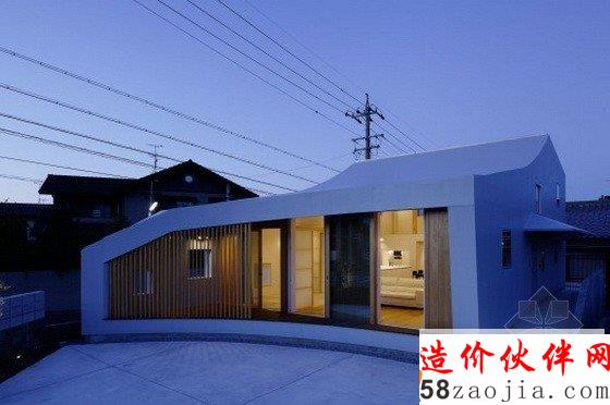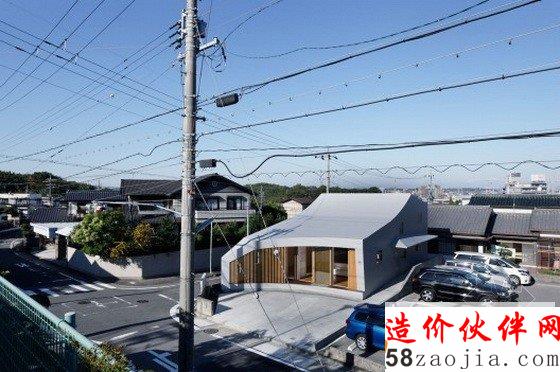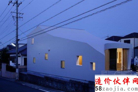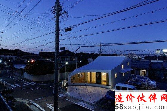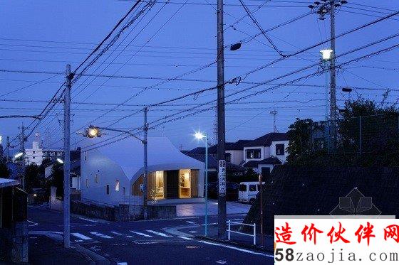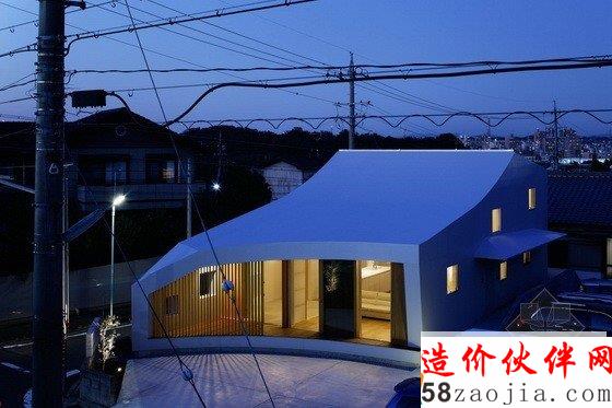 建筑北侧的屋顶设置了狭长的裂缝一样的天窗,随着屋顶轻缓的弧度,阳光弥漫至房间内的每一个角落。由于业主在批发油漆的公司工作,所以来访者能感受到这座住宅是一个涂料的展示空间,室内涂料采用干净的白色;外部采用的防水涂料与室内涂料的颜色一至,简单的颜色更突出了建筑的形式感。