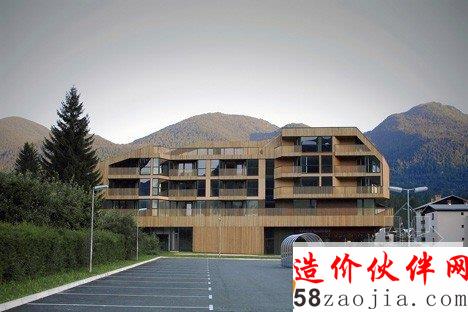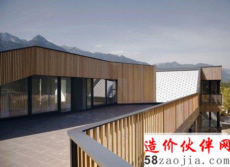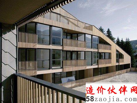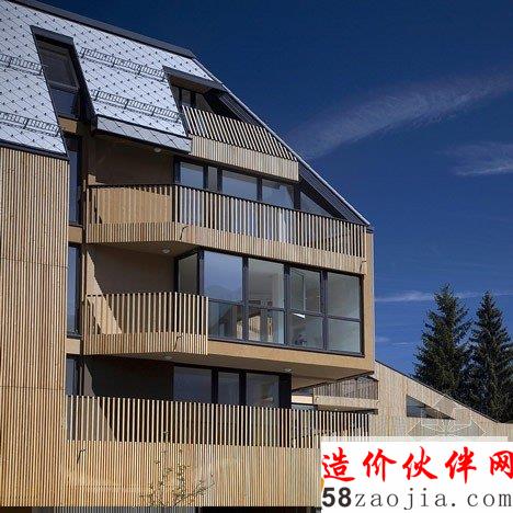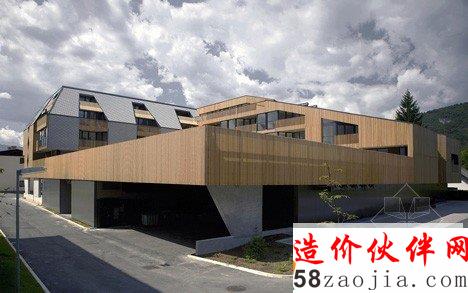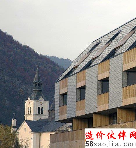 这座建筑由斯洛文尼亚设计工作室OFIS Arhitekti设计,位于阿尔卑斯山脚下的一个村庄里。这座建筑最显著的特色是将公寓设置在一个购物商场的上方。建筑设置在市场L形的屋顶上,这样的布局打开了面向阿尔卑斯山的视野,并且为每户公寓带来了充沛的阳光。