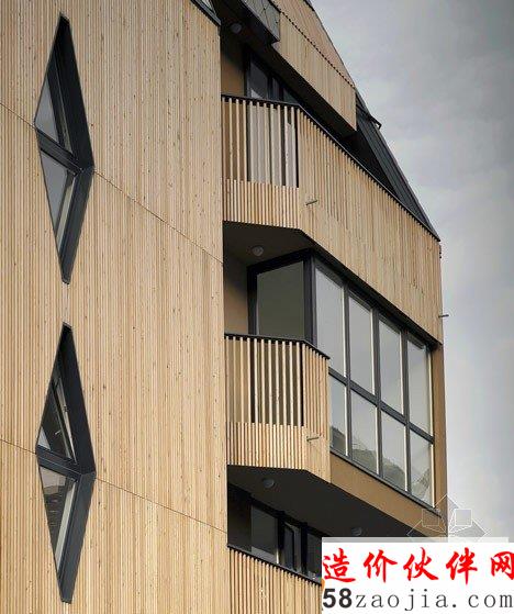 对角斜纹的灰色岩板覆盖在斜屋顶上,在某些地方延伸至墙面,保护它们免受强烈风雪的破坏。西向的阳台也需要免受气候和阳光的影响,所以从外立面向内凹进了一定距离。设计师采用了当地常见的落叶松木作为主要的表皮材料,在墙上采用了竖直排列的线条,阳台上还加设了一些较短的木板条,形成栏杆的感觉。