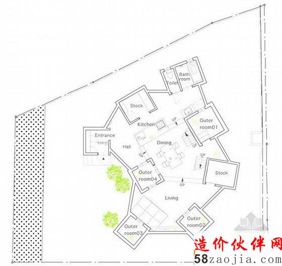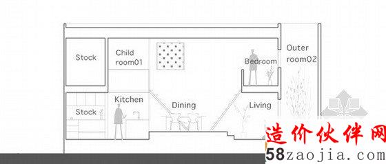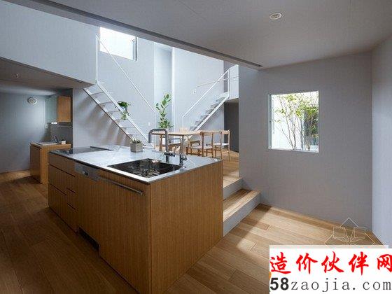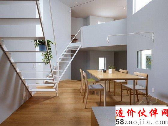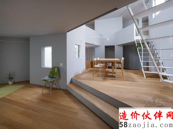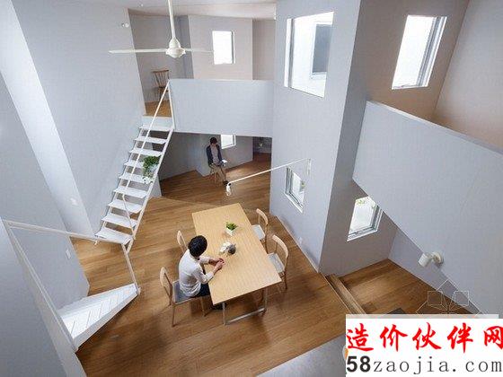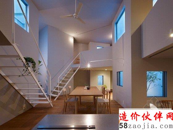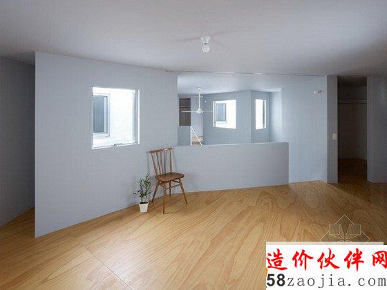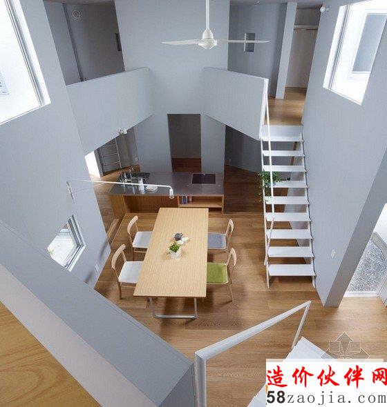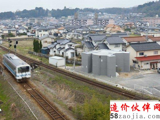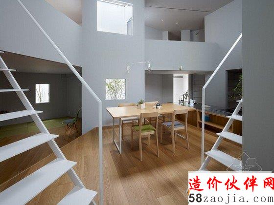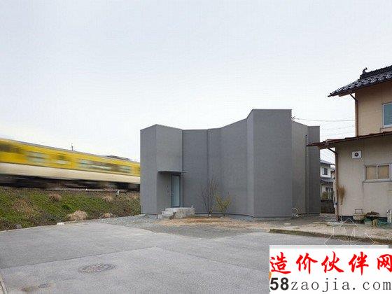 日本设计事务所suppose design studio最近完成了一座三吉的住宅,位于广岛市郊的铁路边上。由于一天中会受到无数次过往火车的噪音干扰,这座住宅采用了连续封闭的外墙,形成一道坚固的外壳,提高了室内的声学舒适度。私人功能空间都位于正方形的功能块内,分为上下两层,窗只开向安静的市镇一边。这些空间的中间是两层通高的公共区域,包括餐厅、厨房和起居室等,也将周围的空间相互联系起来。外围的窗和各种狭长的楼梯空间连接成自由的交通流线和充满光的内院,看上去像是受保护的室外空间。室内采用中性的灰色调墙体与硬木地板的结合,二层则采用的装饰。