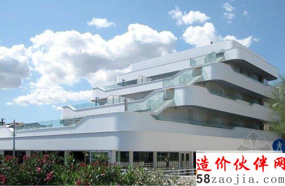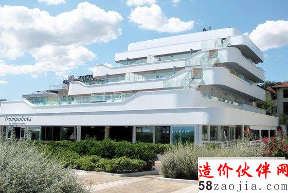 这是由antonio scarponi of conceptual devices设计的意大利trampoline套房酒店。该酒店拥有一个独特的建筑外壳,它是由面积1000平方米的杜邦corian人造大理石制作的。这家酒店有40年的历史,历经改造革新,新设计的建筑外形和船舶十分相似,这里原来是一座蹦床运动场,后来改造成餐厅,并最终成为现在的酒店。