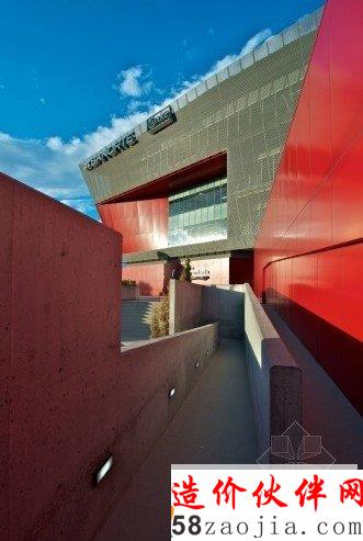 这是由LeNoir & Asoc. Estudio de Arquitectura设计的墨西哥北方银行大楼。项目在一个古老的工业和文教区的中心位置。用地面积达到14400平方米,坐落在蒙特雷城最主要的南北轴线上,附近都是繁华街区,距离大学城和娱乐公园只有几米的距离。周围环境中随处可见的是厂房和仓库一类工业建筑的简朴形象,这样的环境使建筑师们选择了简单的工业化设计风格,整体性很强的体块坐落于混凝土基座上,其间穿插着由红色金属板围护的体块,这些外部形式与内部功能是紧密结合的。由于单层楼面面积比较大,如何让内部能够获得自然采光是一个挑战,所以设计师在每层靠外墙的部分设计了一个室内的开敞公共空间,各层的公共空间位置都不尽相同,用于休闲和其他服务功能,这在1400人的办公空间内是十分必要的。