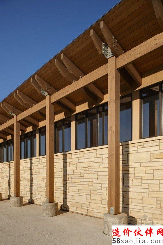 自然的设计语言试图给游客留下似曾相识的印象,采用的木材和石料都是当地易于获得的,并且普遍认为适合于这样具有自然野趣的地方。单坡屋顶是最简单的遮蔽方式,但这种本地化的构筑方式加强了这座建筑的熟悉感和本土化。那些构件、简洁的框架和边缘的交接都是能够清楚地看到的,但是却很难明确的定义。