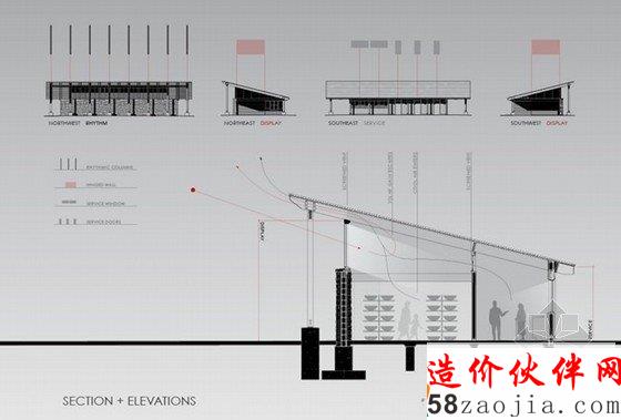 售票处和卫生间都设置在屋檐较为低矮的一边,船只的展示和储存空间则又高又宽敞,充满了阳光。用铰链升起的木质墙壁增加了建筑的质朴感,这两面木墙宽14英尺,它们的开放或闭合让建筑可以变得非常开放或非常封闭。开放的时候不但可以看到湖面的美景,也能清楚的告诉游客,这里是开业的状态。这座建筑主要在夏季开放,完全开敞的时候,仅仅利用自然的采光和通风就能达到舒适要求。