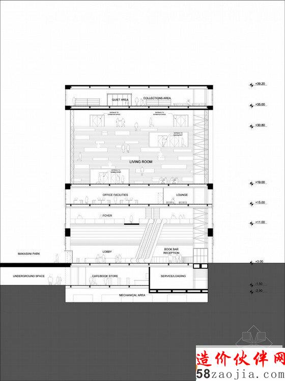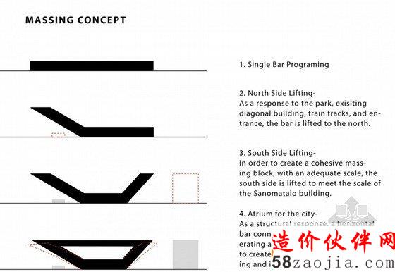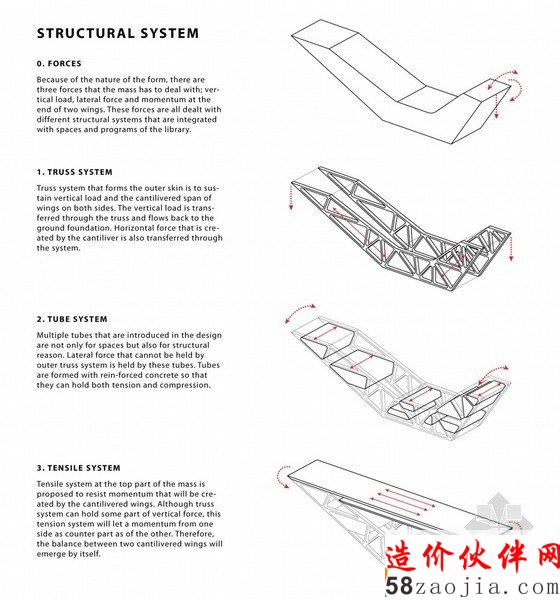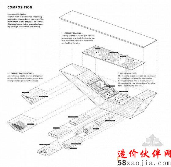 在这个方案中,四种功能都围绕着垂直庭院设置,因此中间的这个城市的客厅便成为建筑中最主要的公共空间,也是城市广场。参观者可以通过这座综合性的公共建筑找到与众不同的角度来重新认识这个城市。那些需要对外封闭的功能区都位于结构筒体之内,这种模式能够让特殊的声、电和温控装置在每个空间内都能发挥良好的作用。在一个封闭房间放电影的同时,一墙之隔的外面可以安静的阅读。公共大厅的空间是通过那些结构核心筒定义的,这样大厅的空间划分可以更为灵活,为使用者提供了多种多样的空间。