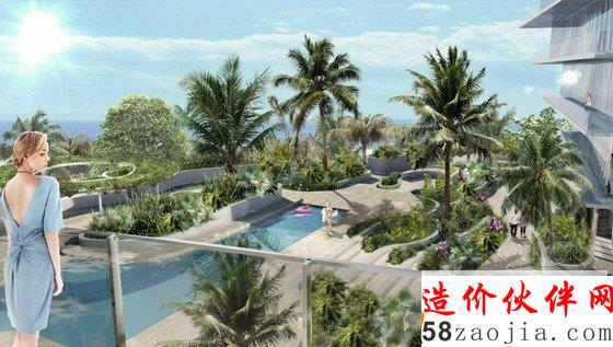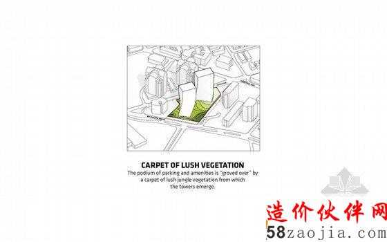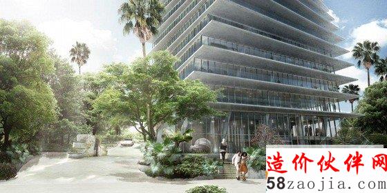 该项目的绿色部分来自著名景观建筑师 Raymond Jungles,他捕捉附近自然生态的美并充分放大成为绿色空间,舞动的玻璃双塔仿佛漂浮在 Raymond Jungles 郁郁葱葱的绿洲之中。
