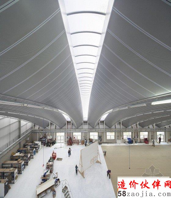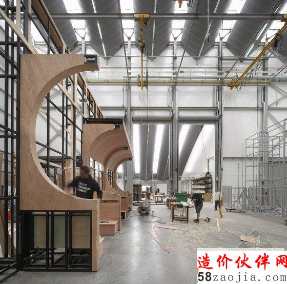 拱形的建筑形式是为了能够完整地查看布景在舞台上的效果。那些屋顶组合照明都设置在大尺度的桁架结构之后,即使是自然光,也要削弱以后才能进入车间,与舞台的照明效果一致。这座建筑形象突出,成为了新产品大学校园中心的焦点。这座加工厂被提名为2011年新伦敦建筑奖,产品校园被命名为2011年的年度项目,并获得了该年度东英格兰的RICS奖。“作为一个工作车间,这座建筑完全超出了我们的预期,世界上其他所有的车间都会嫉妒我们。这座建筑完全转变了我们建造和描绘布景的方式。”