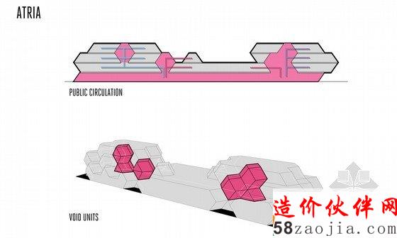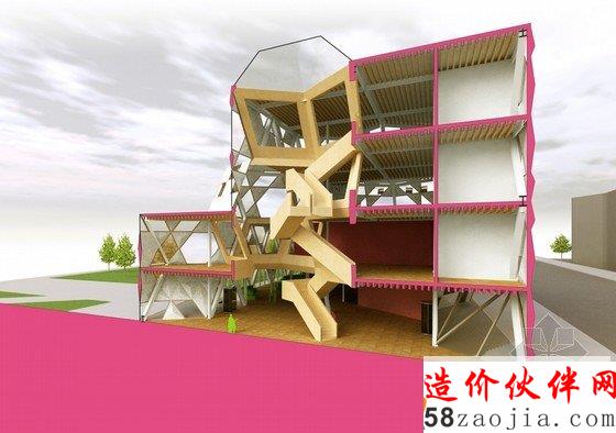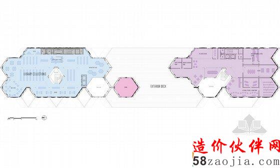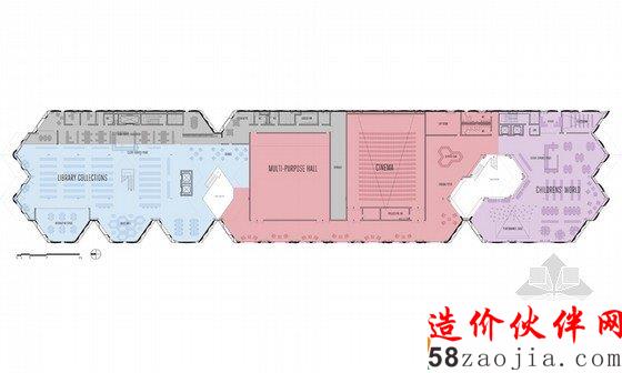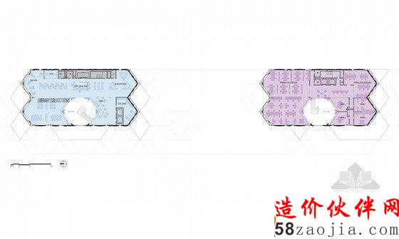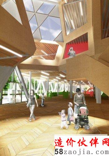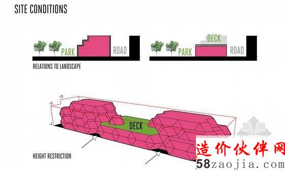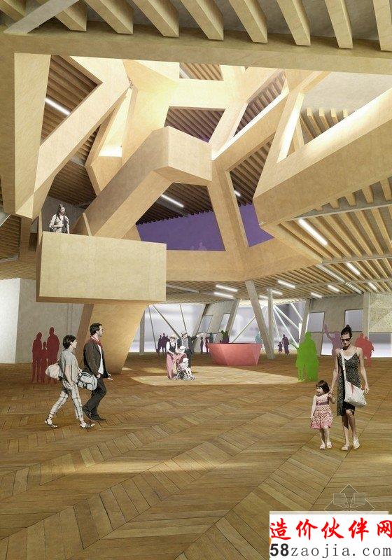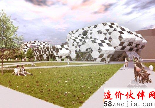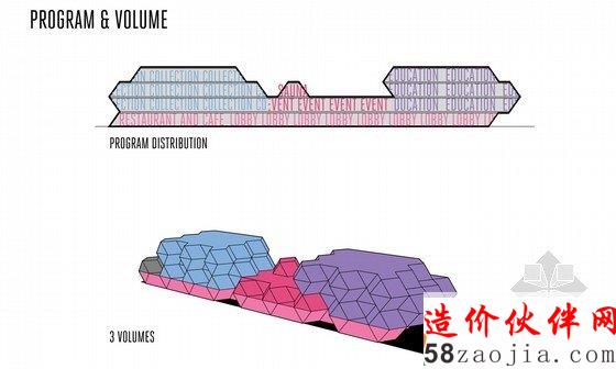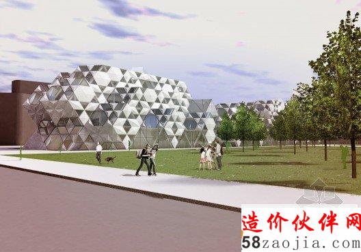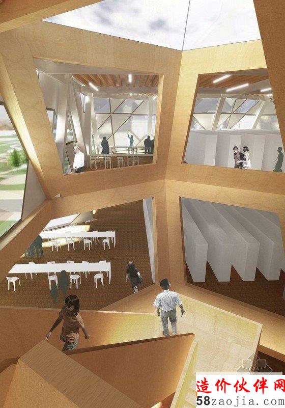 这是由FIRM a.d. 与 OKB Architecture设计的赫尔辛基图书馆方案。这是一座知识交流的中心,不同的人、不同的团体都可以聚集到这里。他们的设计概念是“信息地质学”,21世纪的图书馆就像是沉积岩,知识随着时间不断积累,不同的知识和不同的媒介在这个整体中都能够找到。图书馆已经不再简单的作为藏书库或阅读空间,而是变成信息交换、结合或者分享思想和经验的地方。这一事实在竞赛要求的功能设置中表现的十分明显。在这座10000平方米的建筑中,仅有25%作为书库和阅读空间。赫尔辛基的中央图书馆已经扩展到包括表演、会议和学习等诸多功能。建筑外形是许多三维12面体的结合,可以在空间模数化、立面构件标准化的前提下形成多变的空间,通过调整开窗方向协调与外部环境之间的关系。利用这种多面体的表皮,在夏天形成自遮挡,以避免过多的光照,在冬天太阳高度角较低的时候又利于阳光进入室内。高度限制让建筑不同的立面之间产生了鲜明对比,在西侧,高而平滑;在东侧呈波纹状,与景观相协调。裂缝处是建筑的主入口。