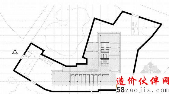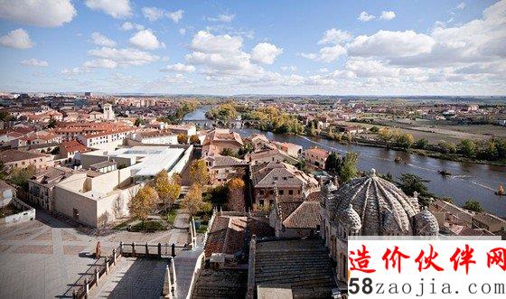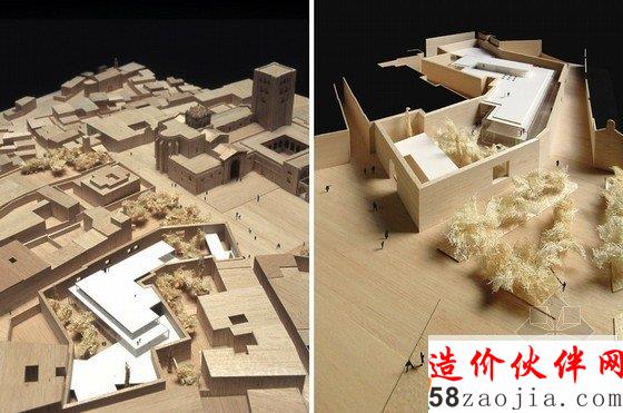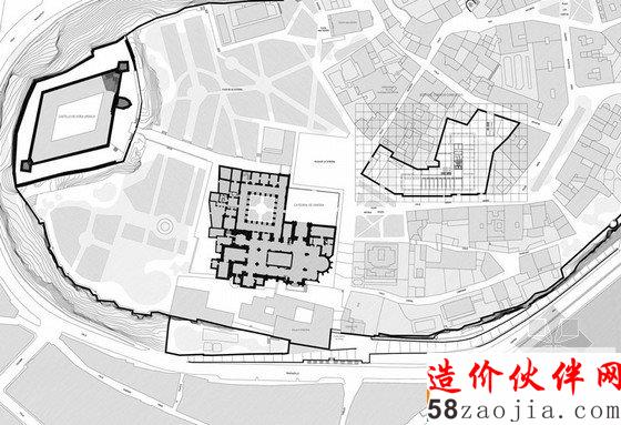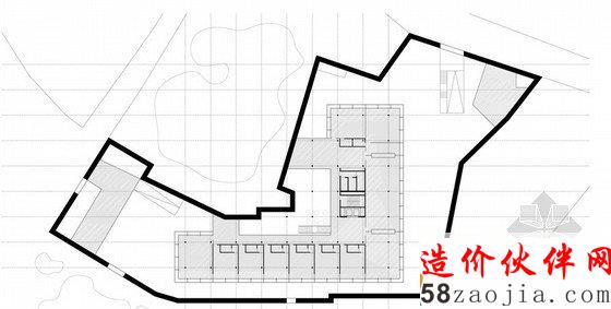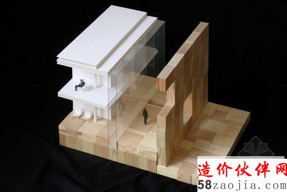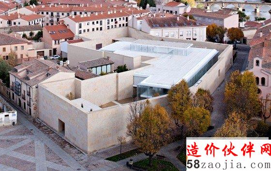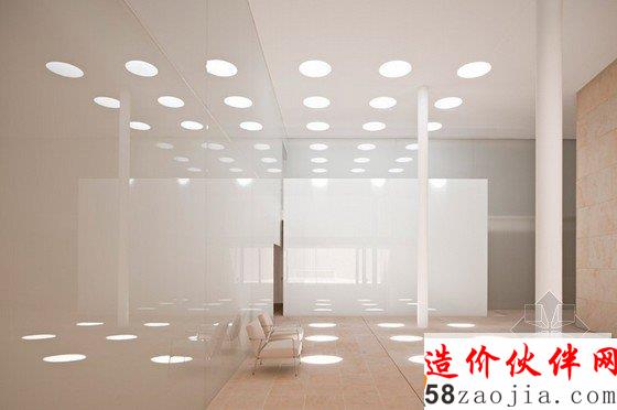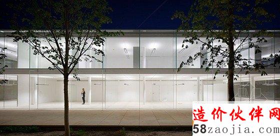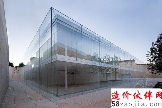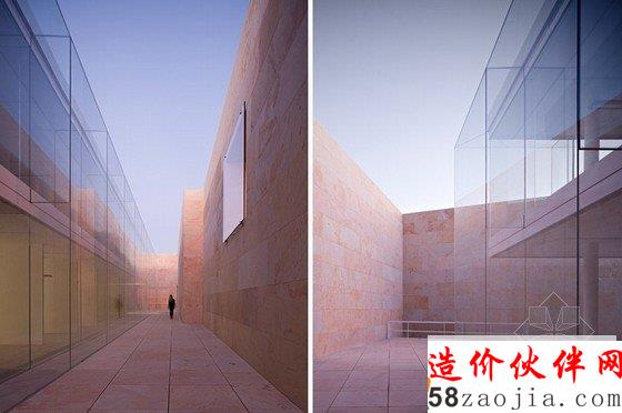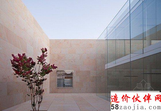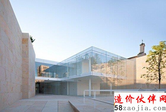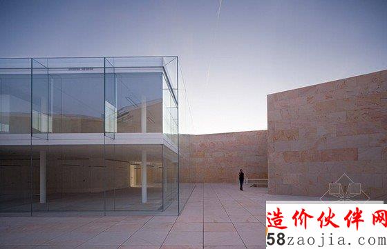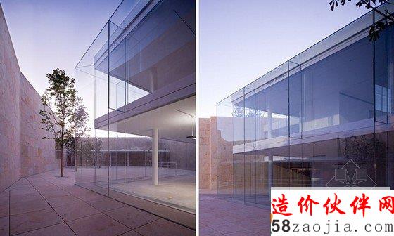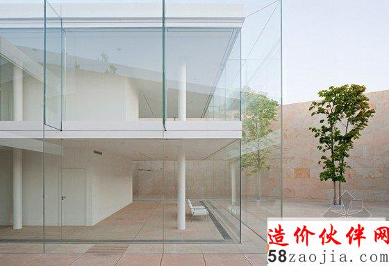 这是由马德里设计事务所alberto campo baeza设计的萨莫拉水晶般办公室。这座办公室位于西班牙萨莫拉一个中世纪古城的核心地带,周围有一条河流经过。建筑面对着教堂和广场,占据了旧教堂的一片花园。事务所利用材料和空间的对比手法,将重与轻、虚与实结合在同一空间内,形成简单而有力的形象。巨大的石墙围绕着多角的用地界线一周,选择性的在某些位置简单的开洞,创造出可以瞥见外面世界的一瞬。入口处的基座上刻录着名言警句,代表着过去和根植于这片土地的记忆。通过宏伟的入口,那种厚重感会被安宁的庭院所减轻,墙体和地面都采用了同种恬静的石材,院落的沉静偶尔被点缀其间的树木打破,而树木的色彩也被周围柔和中性的背景加强了。院落中间,白色的细柱支撑起薄板楼面,周围被6米x3米,1.2厘米厚的双层玻璃板所包围。这一水晶般的结构包括转角处完全由玻璃板和透明结构硅胶制成。与外部的厚重感完全相反,它定义了建筑的界限,形成了具有良好保温效果而完全透明的表皮。两层玻璃间的才是建筑真正的材料:空气。角落里所刻的箴言朝向天空,上面书写着:“未来”。