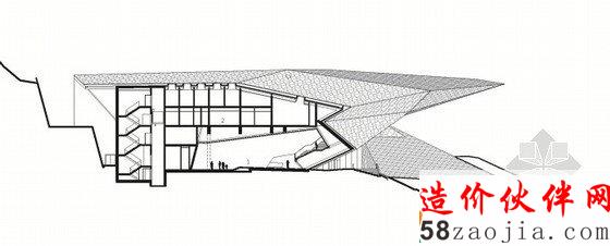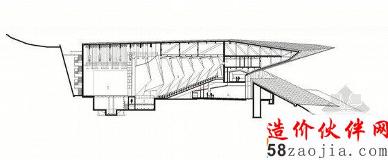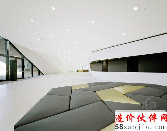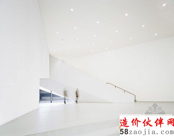 新节日礼堂的配置就像是地质构造的岩层,断裂的地方便是入口处,在夜晚,这座与众不同的建筑中切口与折角的地方会有光线渗到室外空间,让外部的人们能够瞥见明亮的大厅。衣帽间和接待处紧邻大厅设置,不对称结构的门厅为室内提供了多方位的视野,并也能观赏到相对的旧建筑,一个反方向的楼梯将人们引领至上层的画廊,在那里可以通过玻璃幕墙再一次领略到室内外空间的交流。这一层也包含了建筑的第二用途,朝向,功能设置等构成了丰富的交流空间。在这里交通流线时收时放,空间高度不断变化,将外部几何形状转化为内部的空间体验。