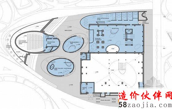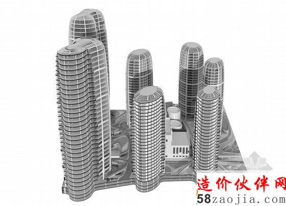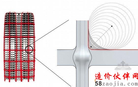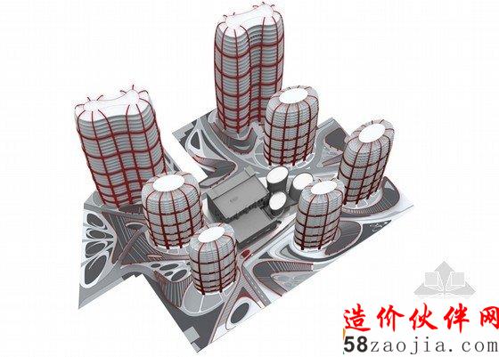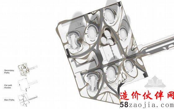 一个由圆柱体和卵状塔楼组成的矩阵将方形的基地分隔成一系列流动的道路,所有建筑围绕一个废旧的发电设施组织排列。凸出的住宅和商务大厦高出其它建筑物,中层高度的场馆建筑则能更好的适应人尺度。椭圆形塔楼的立面是由正交结构网格构成的,随着建筑高度的增加,网格也会改变倾斜度,增强稳定性。绿色空间变成了具有雕塑感的交通元素,将所有功能空间联系到城市尺度上,吸引居住者参与其中。