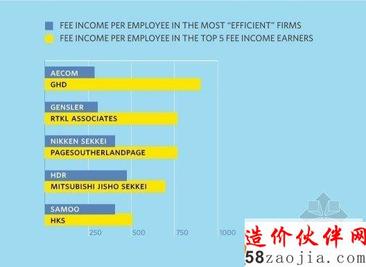 势力最大的(AECOM,金斯勒等)在国际范围内积极追求各种各样的项目(特别是中国和中东),考虑到他们鄂竞争心有多强,这一切并不能理解。 然而,更有趣的是,最“高效”的公司(这些公司的规模远不及前三大公司,也没有大的影响力,却为每名雇员赢得了更高的收入),他们要么在一个强势市场,要么狠多元化,国际化,为自己在市场赢得了一席之位。
