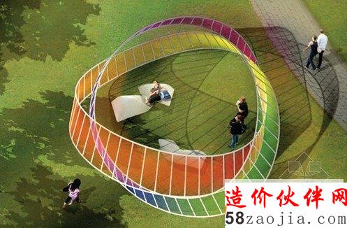 彩虹雕塑是现实与罗曼蒂克的交互作用,如同一条连续的彩带自我折叠,形成一个天然的环状。这座人工雕塑就是对天然景色的一种复制。