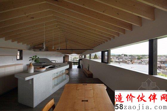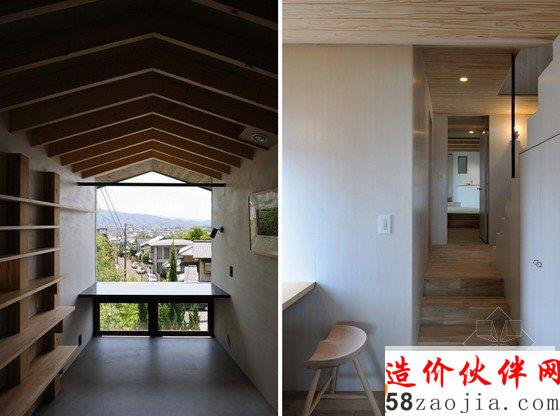坡屋顶采用木框架结构,表面覆盖了一层镀锌钢板。住宅共两层,每层的两端都安装了一个落地玻璃窗,让居住者能俯瞰下方的城市景色。二层设有两间卧室,起居室、厨房、餐厅和一个小书房布置在楼下。