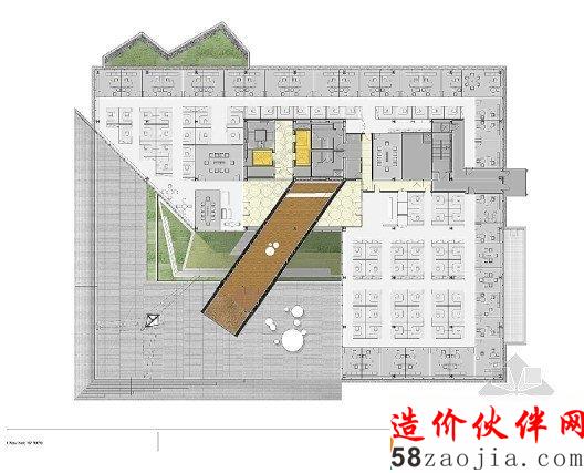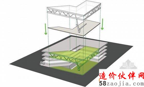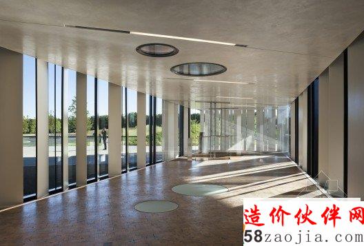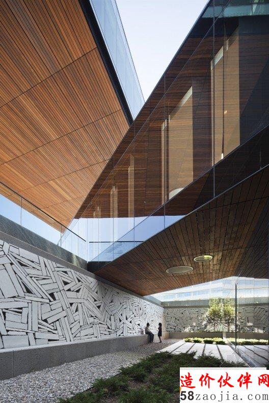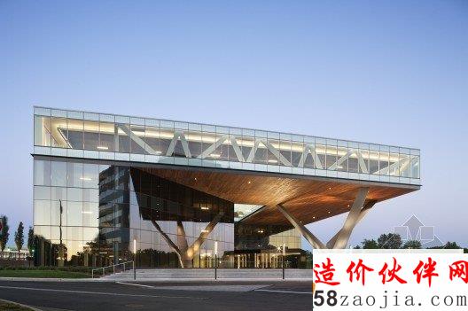 这栋大楼的独特之处在于它运用不对称的树列和构架支撑起了一段楼层,这延伸出来的第四层便成为这项工程的一个“名片”。设计师还在这悬浮的第四层中间部位挖了一个矩形洞,直通底层,方便阳光径直倾洒在大楼入口处。周边金字塔式的构造更让这栋身在市郊的大楼显得卓尔不群,给人带来充满动感的视觉享受。