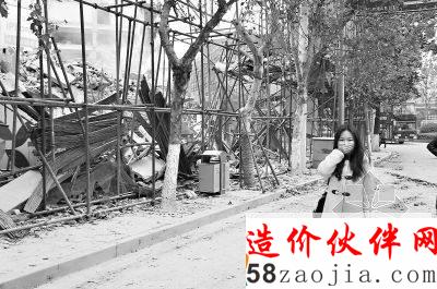 在武胜路与中山大道拐角处,远远就听到工地内两台“啄木鸟”机器在轰鸣施工,被拆除的建筑物不断垮下,溅落在人行道上。