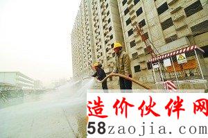 昨天上午,为了防止工地扬沙,在陈庄路的一处建筑工地,工人们正在给地面洒水。 实习记者 和冠欣摄