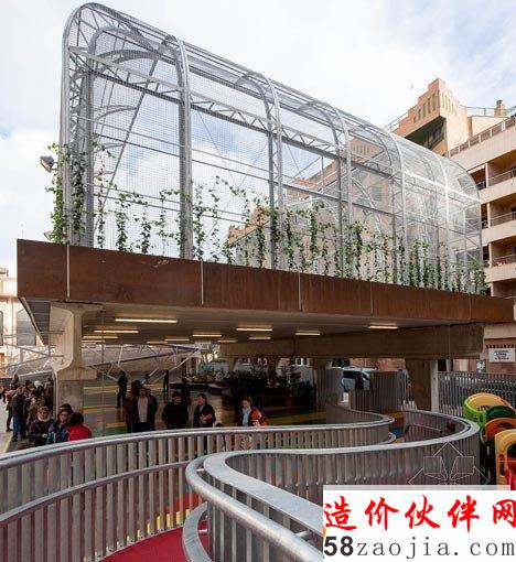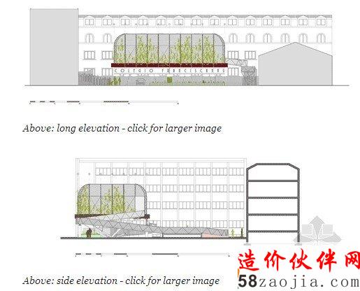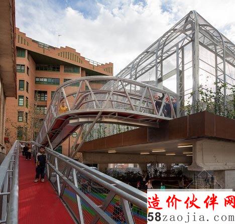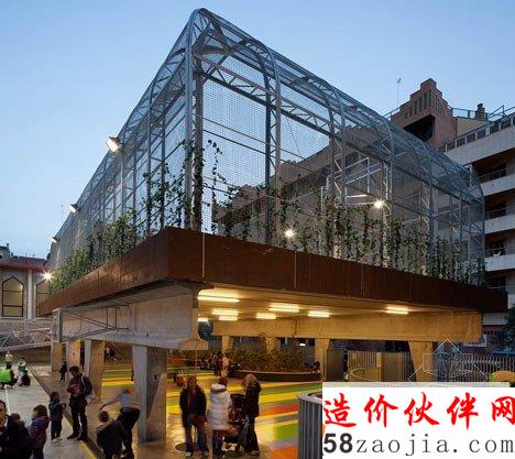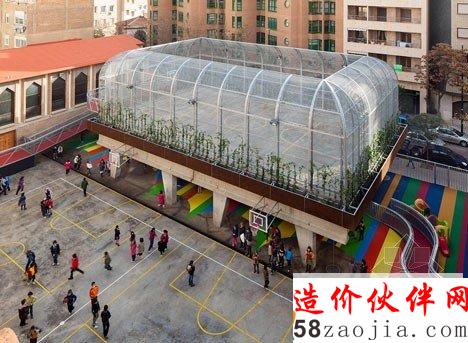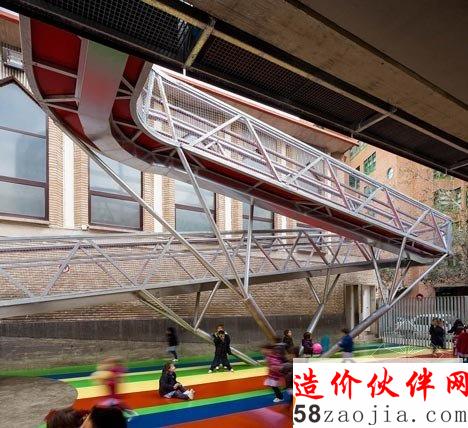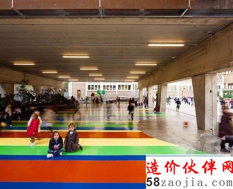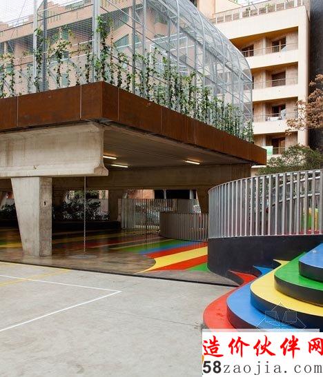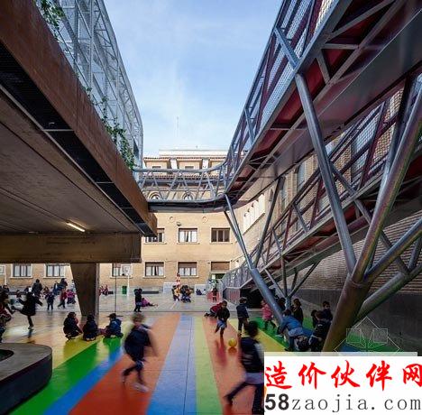 学生在进出校门时总会被操场上的活动所阻挡,所以设计师用混凝土底层架空柱将体育场架高了一层。底层可以通行,也可以算作是一个操场。Yarza Blache被要求要在六周的暑假期间完成建筑,所以他主要采用了这种能在几天内搭建起来的混凝土底层架空柱。