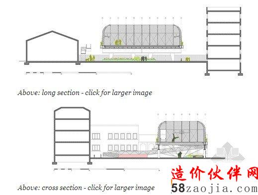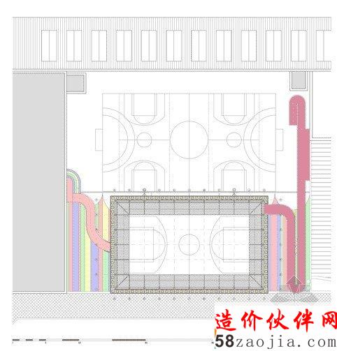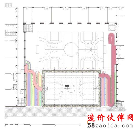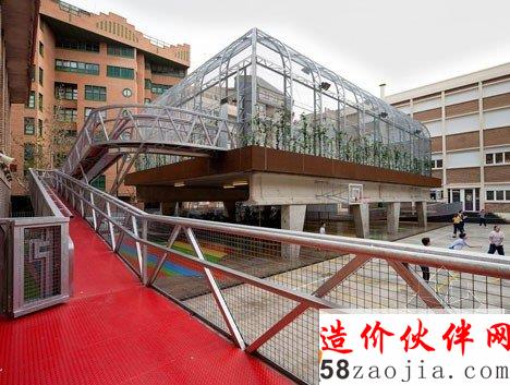 体育场上罩有钢筋材质的双层透明屏障,防止篮球等从体育场弹出。外层是Corten植物箱,常春藤可以蔓延而上,最后包围场馆。建筑两侧都有斜坡,一侧通向幼儿活动中心,另一侧是一个入口。自建成之日起,学生们就根据它的形状,给它起了别名——“鲸鱼场”。