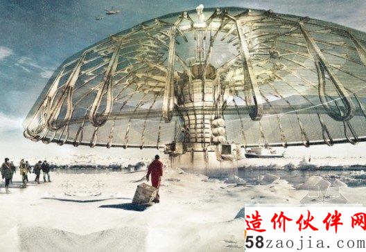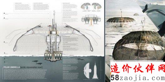 由Derek Pirozzi设计的“超级极地伞”像是一份致力于保护北极的宣言书。在过去十年里,随着全球变暖,南极北极的极地冰盖都变得日益稀薄,出现裂痕,有的甚至融化成为海洋的一部分。重建北极冰层成为保护脆弱北级的最强音。“超级极地伞”建筑中有国家海洋和大气治理署(NOAA)实验室,可再生能源电站,宿舍公寓式的住宅,环保旅游景点,以及野生动物生态保护区。同时,“超级极地伞”巨大的屋面一方面可以减少极地热量的流失,一方面可以吸收很多的太阳能。