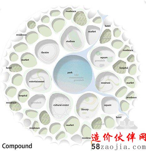 该建筑遵循花园城市的设计理念,整体上是由一系列自给自足的社区所组成的,各社区周围都是绿化带,中间是一座大花园,太阳可以从每个圆柱形的入口照进来。建筑内有居民住宅、商店、办公室、医院及一些娱乐设施。大屋檐结构为道路网、植被及雨水收集系统都留下了足够的空间。雨水到达屋顶后,重新分流至弹坑边缘,创造有利于调节气温的水帘。