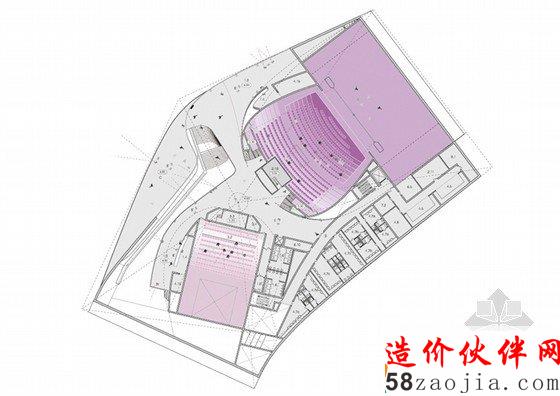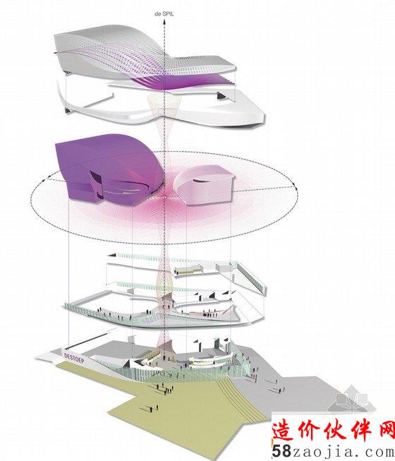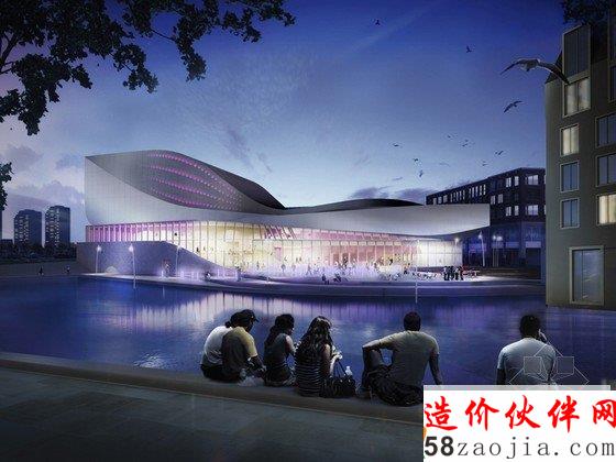 这是由UNStudio建筑事务所在荷兰南部建造的一座多功能的spijkenisse剧院。该剧院弯弯曲曲屋顶呈孔状,通风效果更好更灵活,同时休息室和舞台高塔都可以享受到日光浴。观众席、舞台及休息室相互独立,又遥相呼应。走过门厅和广场,登上一段长长的台阶后,人们可以进入两个剧场。周边有一家咖啡馆,公共区域成半圆形分布。剧场邻水而建,河水交叉映射着冷暖色调,剧场也随之给人不同的感觉。剧场建设时还融入了可持续发展理念,边角处呈圆形,以免影响到周边风车的运转。