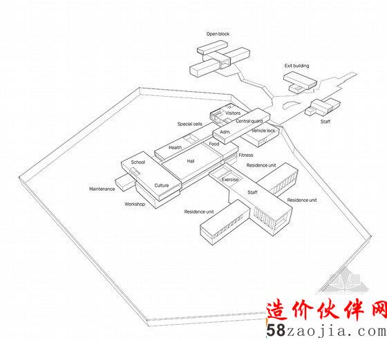 这个方案由五个住宅单元组成,可以容纳76名囚犯住宿,还包括工作和休闲设施、访客区、管理部门和各种技术安全部门。由于坚信外部环境会对人的行为活动产生深远的影响,甲方希望给囚犯和工作人员都能提供一个良好的环境,来让他们在这里更舒适地生活。建筑每个部分的设计都可以让人看到室外变幻的日光和广阔的自然景观。这样,建筑相互联系在一起,同时可以与周围地自然环境亲密接触,在公共休息室的大窗户前,能欣赏到壮阔的自然景象:冰雪、石头、苔藓、蓝天、阳光、夜晚、白天、飞鸟和其他动物。此外,每个人也可以透过各自小屋的窗户,看到室外无垠的天地。整个建筑的设计既优美又质感粗糙,重视开放空间、光线、事业、安全和设计灵活性,精简框架结构。混凝土、木材和钢材等材料的选择也是希望将建筑尽量融入周围景观环境中去。
