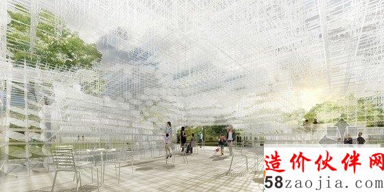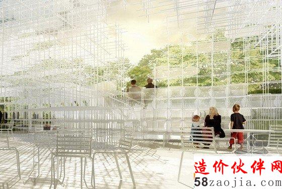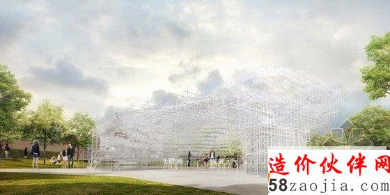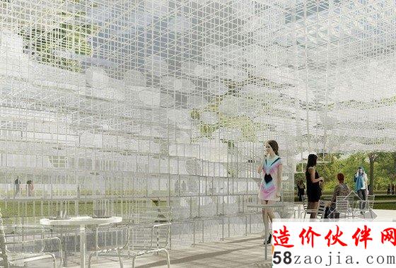 这座透明的不规则云状建筑物约350平方米,主要由一个精致的金属网格结构组成,它由许多20mm的钢管建造而成,将创造出一个互动式的建筑景观。蛇形画廊将举办多种多样的活动,建筑不仅仅深深的嵌入到基地文脉中,更要顾及到社会生活的方方面面,最终设计出的是一个迷人的建筑物,它几乎像是漂浮在空中,围绕在参观者身边。