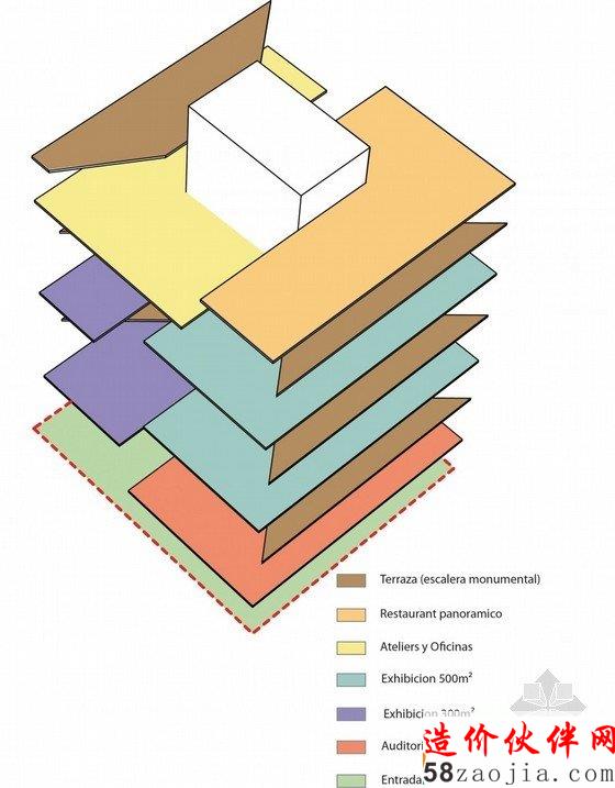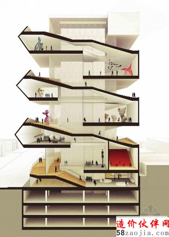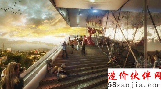 这一荣获了优秀奖的设计作品包括一个由三块间隔分布的立方体系列和穿插其中的透明凹陷空间。三块立方体旋转式地指向天空,使建筑显得动感、壮观,充满力量。众所周知,瓜达拉哈纳城是墨西哥第二大人口稠密城市。在这里,纽约古根海姆博物馆举世闻名的垂直建筑路线得到了重新的诠释。而与Frank Lloyd Wright(古根海姆博物馆的设计者)的方案不同的是,在查普特佩克文化中心的新项目中,建筑是向城市延伸的,因此前来参观的游客在这里可以看到瓜达拉哈纳城的360度全景图。一座融合了西班牙统治前的美洲建筑传统的雄伟楼梯,将人们带入一个仿佛登入天堂的幻境中。