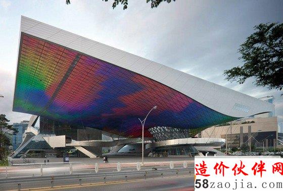 他带领的Coop Himmelb(l)au团队设计的韩国釜山电影中心最近获得了休闲建筑设计方面的世界性奖项。而这个建筑的特别之处在于那巨大的悬挑屋顶和屋檐下五彩的LED灯。这个建筑既有私密空间,又有公共空间,二者相互结合,形成了室内外空间的序列。这个建筑包括:城市山谷、红毯区、星光大道、纪念园和釜山国际电影节(BIFF)运河公园。屋顶成为了这个建筑最重要的表达语言,与通常在建筑中扮演的保护角色相比,重要了不少,成为了本次设计中一个重要的元素,效果十分具有视觉冲击力。城市山谷位于建筑中央,融合了整个建筑不同空间的不同概念。它可容纳4000观众,外面是透明玻璃,与周围的各种功能空间有着视线上的交流。