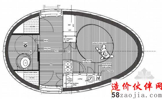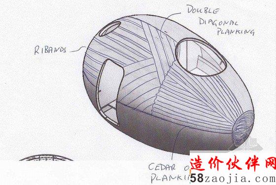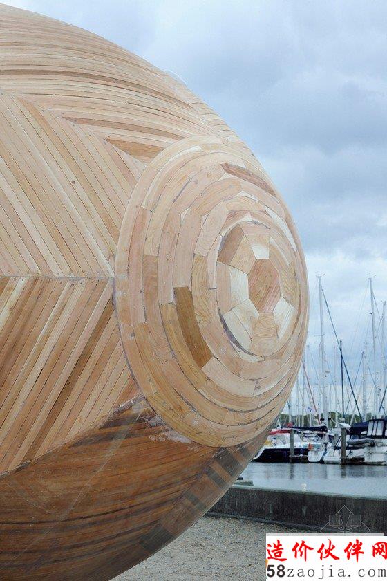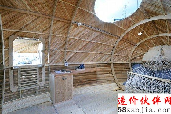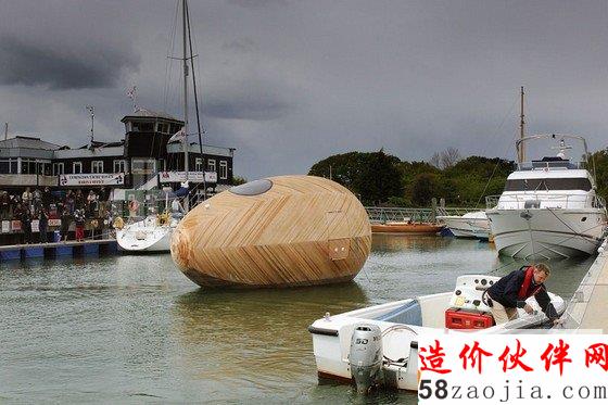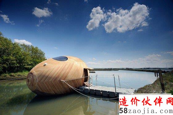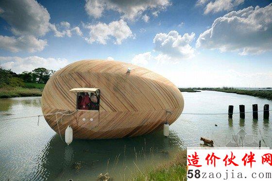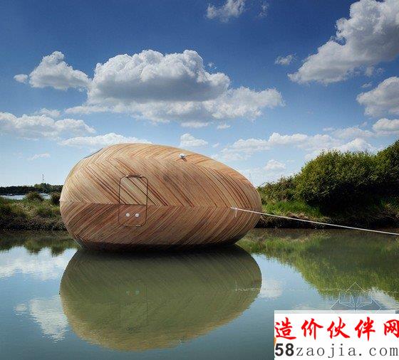 这个蛋形建筑既是一所住宅,是一所研究潮溪的实验室,还是一个拥有整套储藏区和展示区的收集整理中心。设计师在建造这个蛋形空间时,利用造船技术,采用的也是当地材料。建筑内包括一张床、一个桌子、一个小火炉和一个小房间。在每日730次的潮汐影响下,这个蛋形建筑水下部分会生出铜绿,而365天的风吹日晒将会漂白水上的木结构部分。