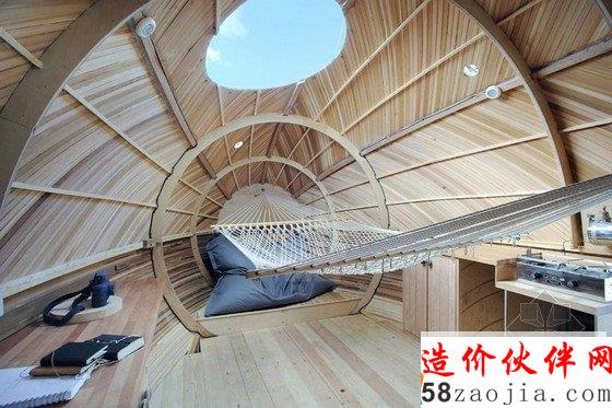 这个蛋像船一样被“固定”在摇篮式的结构中,会随着潮汐上下起伏。该蛋形建筑具有轻盈的触感,同时选用当地的自然材料,力图重新定义我们的生活方式——我们应该增强可持续发展意识、保护自然资源。艺术家斯蒂芬乐于研究建筑与自然间的关系,通过对当地自然周期及人类各季节活动与环境关系的理解,斯蒂芬建造了一种全新的建筑。斯蒂芬要想为各种电器充电,例如笔记本电脑、数码相机和手机,都可以通过太阳能获得。该蛋形建筑是在以下两个主要的设计原则下建筑的——“精益、绿色和洁净”“减少浪费、重复利用和再循环”。