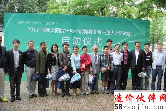 2013年6月9日上午,由北京交通大学建筑与艺术学院主办的“北京交通大学太阳能十项全能竞赛启动仪式”在北京交通大学隆重举行。出席启动仪式的嘉宾有北京交通大学副校长关中良教授、住建部前总工程师、瑞典皇家工程院许溶烈院士、住建部科技与产业化发展促进中心姜中桥副主任、中国住宅与居住环境工程中心仲继寿主任、住建部科技与产业化促进中心信息处许利峰处长、中国国际太阳能十项全能竞赛组委会田园女士、香港可持续科技发展基金会北京首席代表顾蓉女士,以及教师学生和赞助商代表(奥润顺达、中轻太阳能、hunter亨特、新立基、大运龙腾、晶澳太阳能组件、维森、北京锐志辉煌科技有限公司、海信集团、中国铁建集团、WSP维思平建筑设计、北京新型建筑材料设计研究院、北京市太阳能研究所集团有限公司、北京桑普文化传媒有限公司等)。