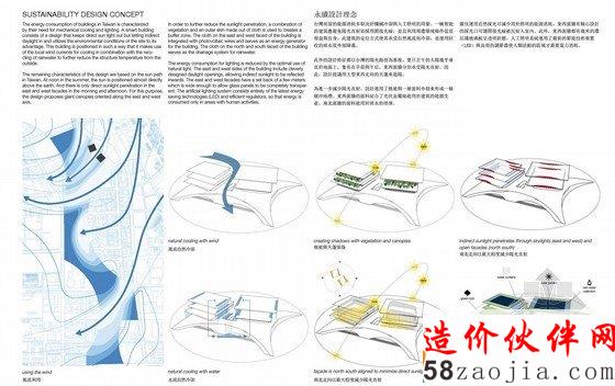 机械降温和照明是台湾建筑的能耗主体。本个方案包含了智能建筑的设计理念,具有可调节直射光线和反射光线的系统;同时优化利用建筑位置本身的自然因素。建筑的设计朝向可利用当地的盛行风气流来降温,并结合雨水回收来进一步降低外部环境引起的结构温度过热。照明的能耗通过优化自然光的使用得以降低。建筑的东、西立面拥有巧妙设计的日光开屏,允许非直射光线向内反射。东、西两个立面向内退后数米,宽度可避开直射光线范围,使玻璃镶板得以完全透明。人工照明系统包括最新的节能技术-发光二级管照明(LED)和高效的调控设定,只在人们的活动区域提供照明。