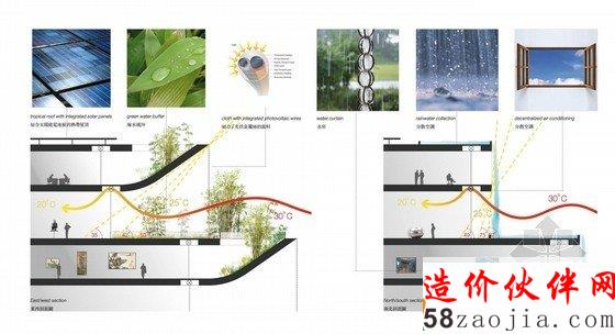 方案设计的其它特点建立在台湾地区的日照路径上。夏日正午时间,太阳位置与地面几乎成直,而建筑的东、西立面只有在早上和下午有照射阳光。为此,在东-西轴设计了巨型顶棚。为了进一步地减少阳光直射,设计方案混合运用植物和一种由布料制作的外表皮形成缓冲区。东、西立面的布料表皮整合了光伏网格,用于为建筑生产能源。北、南立面的布料外表皮则成为降雨排水系统。