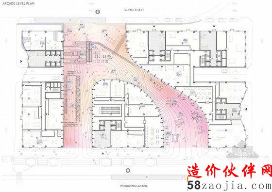 他们希望通过与周围地区的城市基础设施的联系,为这里带来不间断的活力、人群和令人难忘的底特律城市印象。尽管在过去的几十年里,底特律市中心的人口和活动都有减少,但是最近的文化设施(如剧院、体育场)、写字楼和商业设施的涌入都给这个地区带来了前景乐观的发展空间。但是由于Woodward Corridor商店营业时间的限制,还没能完全实现24小时无间断保持活力。这个项目希望完全唤起底特律市中心的活力,所以在原有文化设施的基础上,鼓励各种商业零售店延长营业时间。这里已经有了24小时开门的Arcade百货商店,和延长了开放时间的艺术画廊。 Woodward Avenue建成后,连同原有的单轨系统,都将与未来的轻轨线联系。这个“隆重开放”项目将会改变过去充满活力的J.L.哈德逊商业地区,转变成一个充满活力的居住、工作、游览、娱乐和投资的社区。这里还会将底特律市中心和其他地区联系在一起,吸引更多的当地人和游客来这个新的城市中心。这个区域在南部商业区和北部中心文化艺术区之间。通过联系每个地区不同的活动和场地,为这里同时带来不同的能量和活力。除了大型商店Woodward Avenue,为了充实这里,很重要的一点就是重建城市走廊,加强建筑主轴线。现有的单轨和新规划的轻轨系统都会经过这个地区,为这里送来了大量客流,这个建筑也成为两个交通系统的交汇点。综合考虑了以上方面,本设计定位将成为底特律繁华热闹的新中心,连接着城市中的各空间。
