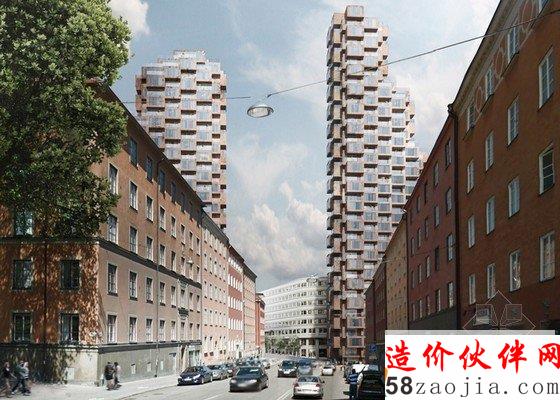 双塔高低变化的造型强化了整体的印象,为了向斯德哥尔摩的Hagastaden新区提供一个门户形象,城市的指导原则要求建筑具有复合型功能。OMA通过将居住空间和户外空间内外置换,形成外部表皮凹凸变化的效果。