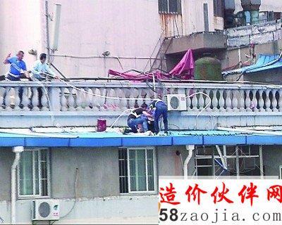 2名已经等待多时的突击队员,身系安全带,从九楼的平台上悄悄翻越过护栏,向王某所在的8楼违建屋顶靠近。就在王某察觉不对劲的时候,他的手和脚已经被两个队员死死摁住。紧接着,后续的队员们相继攀越护栏,一拥而上,很快,王某被队员们抬出了违建的楼顶,安全“着陆”。