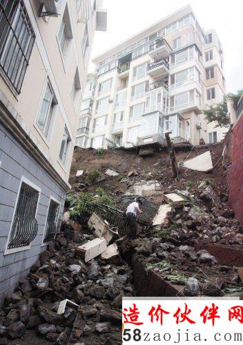 挡土墙上方的居民楼地基已悬空。