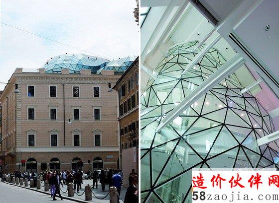 一个三角形的玻璃设置横穿过建筑直通到屋顶,这一设计可以让人们在一个起伏外壳建筑之下享受晚餐。它的钢结构提升至7.5米,到达最高点,并且覆盖了300平方米的饭厅空间,而在这里还可以欣赏到圣安布罗斯和卡罗埃尔克索教堂美丽的圆顶。在白天,闪耀的表面可以当做镜子,而在夜晚,整个建筑看起来则像一个灯笼。在建筑的较低水平,这种设计由于包含了垂直循环元素,所以可以允许人们参与其他楼层的活动。由玻璃架子和闪亮的白色玻璃纤维组成了一个入口的集市显示区。色彩上面,分别有橙色,红色,紫色的显示模式。LED灯组照亮了楼梯,和展览,并与外立面的颜色互补。