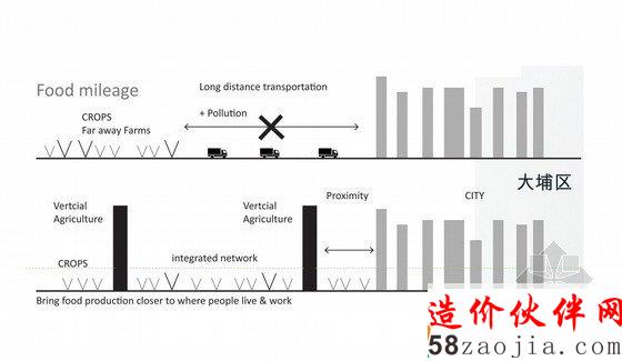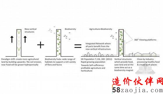 此项目位于大埔区,是香港第二大行政区域,建筑师们用一个垂直网络式的结构取代了原始的模范式结构,这样的设计就可以使这个地区的农业有序且呈网络型发展。自从2000年以来,中国的城市化进程不断加快,并以平均每年10%的速度发展,虽然中国的农业产量是世界上最大的,但是,只有陆地面积的15%可以进行种植。所以由此可以看出发展垂直网络农业是十分有必要的。中国的空间是有限的,农业问题在中国整个历史发展中,一直是一个非常重要的问题,曾经也经过粮食短缺的困窘。而生态高效的农田已经随着时间的推移,扩展到了西部和北部,并已经取得了部分成功,与东部的土地相比,这边的土地通常是处于寒冷且干燥的环境中。19世纪50年代意外,这样的农业土地也被工业占地需求和城市化进程扩展的挤压的所剩无几。我们的设计灵感来自于中国水稻农业的惊人转变,这种水稻农业是将土地拉伸成梯田形状的生产结构,这种结构有利于作物采光的同时,还具有抗药性的特质。建筑师们建议将波纹板和灯结构系统纳入设计中,以便于配合金属材料的回收。这一187.50米的生态农业结构将吸引全世界的游客,并将成为新的教育和农业研究基地。
