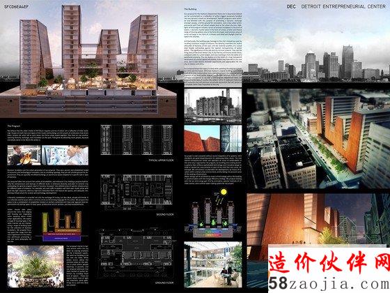 整座建筑由美国建筑公司studioefra设计完成,包括Efrain velez, Juan nunez, Marko Kanceljak; Kalamazoo, Michigan等知名设计师。因为外部材料钢表面有生锈的迹象,所以建筑的天际线轮廓很像一个工厂。动态的综合开发旨在激发新的城市精神,既创业精神,这将有助于带动人们回到城市的核心地区。专门为企业家和创业企业建造的设施是一系列的企业孵化器。因为整个团队的愿景是城市发展的未来模式。这个城市需要的是行动,而非许多静态建筑的集合。设计将通过城市街区中间的空闲区域来完成内部职业多样化,从而使整体视图平衡。艺术和手工工作室将会设计成开放式的,这样室内就可以接受很好的自然光。高科技领域包括实验室空间,一个适当的网络基础设施实验室和科学技术发展工作室。住房类型有微公寓和行政公寓,这样的设计使得一天内的所有时间内,整座大楼都是活跃的。“底特律创业中心”是一个集地区可持续发展,能源节约,技术先进和设计创新为一体的高品质建筑。