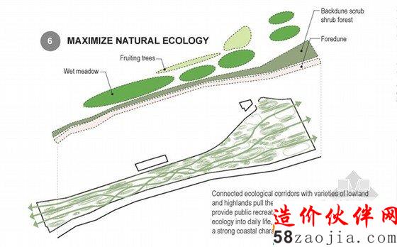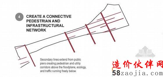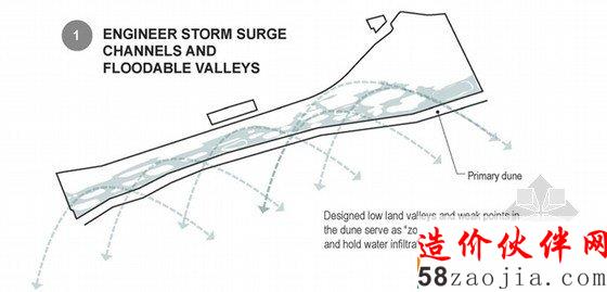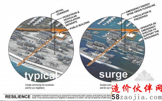 这一项目被称为“一个有弹性的Rockway”(FAR ROC):通过几个小平台提高地面的水平和提供额外保护的土丘。在海平面上升的情况下,一个作为基础设计的土地将保护这一地区。为了减少填充的质量,根据地球在结构上是圆的,这样就利于形成一个正弦波将其全部包括。设计另外包含了救援通道,在自然灾害来临的时候,可以起到优化排水的效果。他们由高架道路连接,其中包括在正常情况下作为商业街的中央轴,和紧急情况下的一个出口道路。
