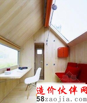 小屋主体为木结构,外覆一层铝板。小屋长3米,宽2.5米,采用三角形屋顶,最高3.7米,室内面积为6平方米。拉开小屋前门进入起居室,左侧是折叠桌和椅子,右侧是一张长沙发,拉开就是一张床,可供1.83米的大汉就寝。一面墙壁上的窗户,再加上一侧屋顶的大块玻璃,保证了室内的采光。起居室后是厨卫空间。厨房的操作台上放着一个电炉,下面藏着一个冰箱,卫生间里装着淋浴设备和嵌入式马桶。别看屋子小,还有专门的储物空间——厨房屋顶。另外,起居室与厨卫间的隔墙,或挖进去一块,或外挂储物箱,方便容纳各种小物件。