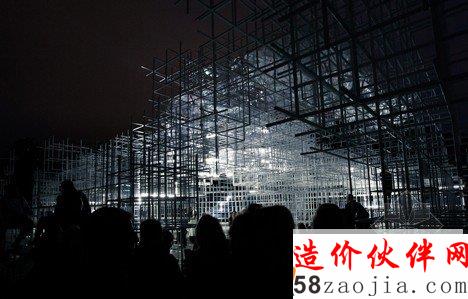 统一视觉艺术家(UVA)使得展馆看上去像一团白色雾蒙蒙的云,通过使用闪光模仿闪电,使它看起来像一个雷暴发生在里面。工作室在上周的问答环节上,说:“特别之处在于旨在激发苏藤本的本事架构的特点,它代表的是一个有点宁静的积雨云”, “我们的干预旨在建筑结构内唤起一场恐怖的,相对压倒性的电风暴,只是单纯为了把带它带进我们的生活。”