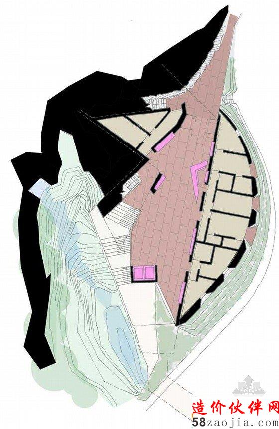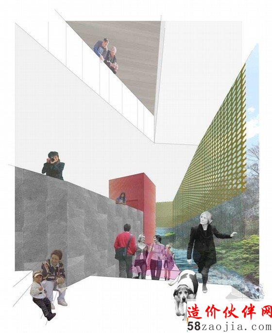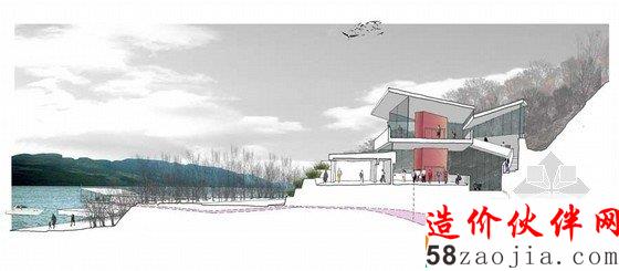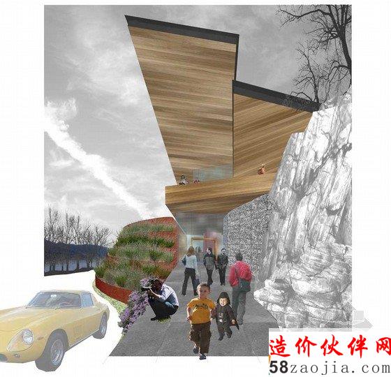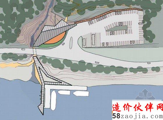 北方大规模的Great Glen古代地质断层,要求一个更高的观测点.繁茂高大的树木就成了这一更加高级的观测点.该地块有一个十分引人注目的轮廓,此处有包含丰富的植物.是苏格兰地区独特的生物多样性地区. 建筑师们认为在这里, 自然生态和美丽的土地都不足为奇, 因为在此处对自然的理解是建筑项目中非常重要的一个环节. 建筑师们在设计这一项目的时候. 注意与周围的自然景观和谐共处, 并以此来鼓励人们探索自然和周围狭长的湖区. 该地区急剧上升至北A28,在停车场后面有一片桦树和橡树组成的自然林地。在西南边界处又一条小溪形成的狭窄的水道。该地区制高点可以欣赏到美丽的自然景色,以及整个湖区繁华的景象。树林石头岸边沿着东南方向的道理,提供了一个不间断的视野,和一个游玩嬉戏的空间。阳光明媚的时间里,人们可以在这里尽情的游玩。这一地块的功能设计十分精巧,从建筑到后面的停车场,可以通过一个有庇荫的通道直接到达。在建筑里有一个轻松的釉面路线,向下通过一个长满青苔的地下通道可以到达下面的超市。自然景观的最大化要求窗户朝向空旷开阔的地方,并让自然阳光照射进来,这样才能在这个地址上创建一个更吸引人的建筑。游客可以穿过地下通道来到树木繁茂的海岸,一系列领先的坡道和楼梯可以带游客去船只码头或者凸起的眺望台。除此之外的甲板散步区域,座位区域沿海而设,以便于阳光灿烂的日子里人们游玩休息之用。