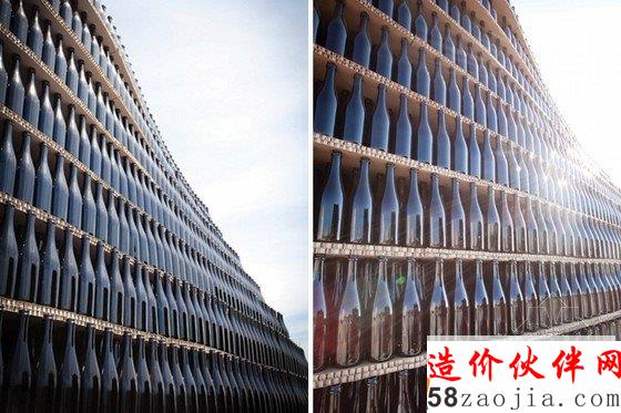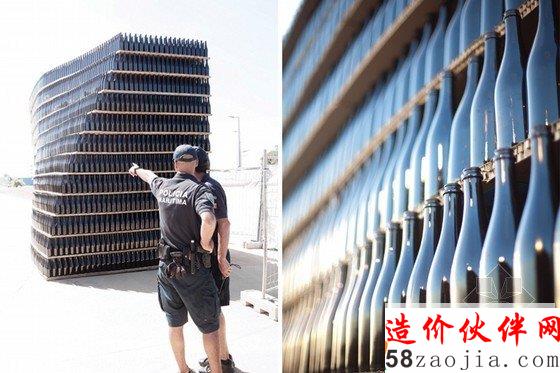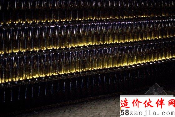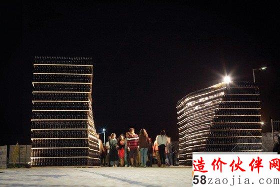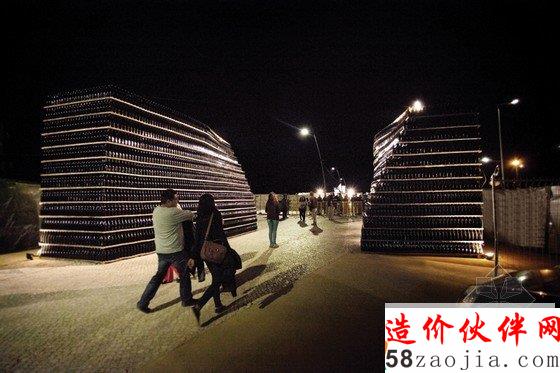 Fahr0213设计设计的盛典入口是Figueira da foz地区最著名的工厂建筑,是由50000个玻璃瓶子1332平方米的蜂窝纸板构成。这一艺术作品是基于交融或者说是两种结构的“浪漫”建立的。在这个入口处,有一个十米长的缺口,这一空间在游人进入节日盛典中作为一个缓冲的区域。两个冰山形状的欢迎式建筑物作为游客们的参照物。当然啦,这两个冰山式的建筑也是这座城市中极其精美的和独具吸引力的艺术品。这些玻璃瓶子的安装给游人们不同的重复和水平蜂窝的感官感受,突出了玻璃饼子的外在凹凸感。