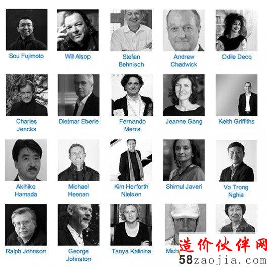 评委名单包括世界著名建筑师:查尔斯詹克斯(Charles Jencks),Dietmar Eberle,(Sou Fujimoto),珍妮刚(Studio Gang),穆拉特,奥迪尔(ODBC),金(3XN),佘崇霖(Ministry of Design),米歇尔(Rojkind Arquitectos),费尔南多曼尼斯((Menis Arquitectos),拉尔斯(Realdania),等等。